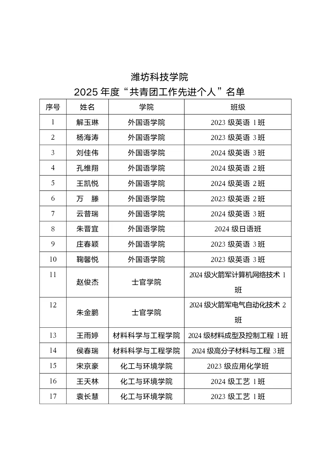 为表扬先进,进一步激发广大团员青年和团干部在团学工作中的积极性和创造性,我校组织开展2025年度“共青团工作先进个人”评选工作。本次评选坚持公开、公平、公正的原则,严格按照团支部推荐、资格审查、综合评议、集体研究、择优确定的程序进行。经综合评定,拟授予解玉琳、杨海涛等130名同学潍坊科技学院2025年度“共青团工作先进个人”称号,现予以公示。公示期为2026年1月7日-2026年1月9日。