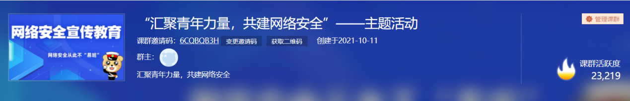 此次活动时间为期一周,我校易班工作站通过易班优课平台发布网络安全教育方面的短视频与知识试题,引导同学们学习诈骗防护的相关知识,增强同学们的自我防范意识。截至10月20日下午,“汇聚青年力量,共建网络安全”—主题活动课群成员13142人,课程累计观看人数达48289人,知识竞赛参与人数为11701人,课群活跃度达23219。本次网络安全知识竞赛活动的开展,提高了同学们的网络防范意识和自我保护意识。