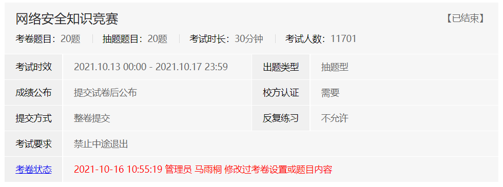为深入贯彻落实国家网络安全的相关规定,增强同学们的网络安全意识,保障同学们在网络空间的合法权益,营造良好的网络环境。近日,我校易班工作站利用易班优课平台,在全校范围内集中开展了以“汇聚青年力量,共建网络安全”为主题的知识竞赛活动。