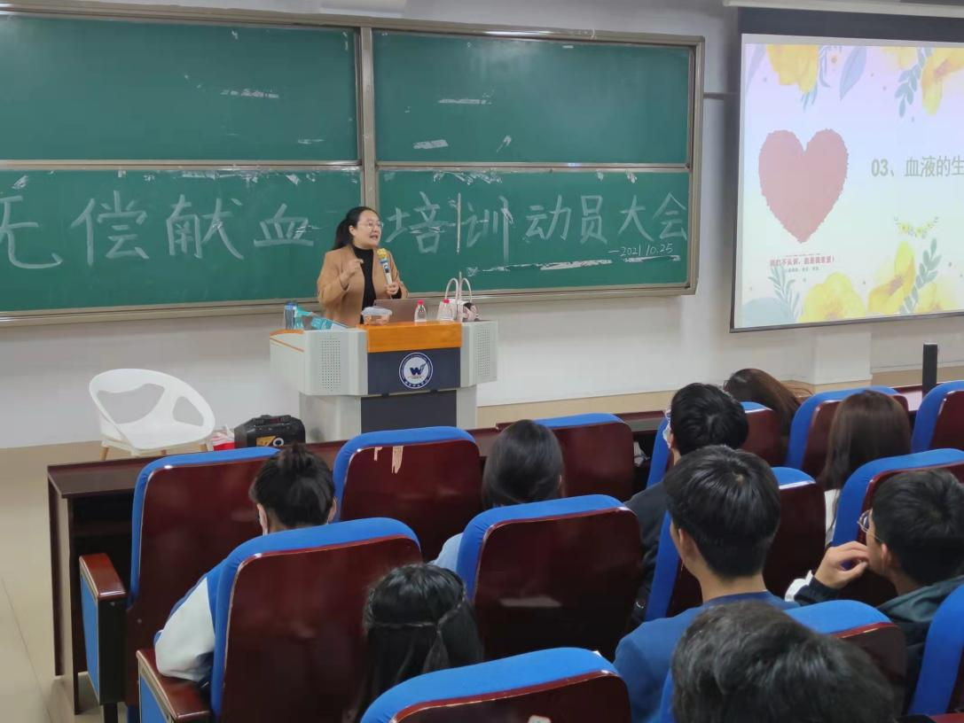 为确保我校无偿献血活动顺利开展,2021年10月25日晚,我校青年志愿者服务队协同潍坊市血站中心杨馨燕主任于通识219开展无偿献血知识讲座。