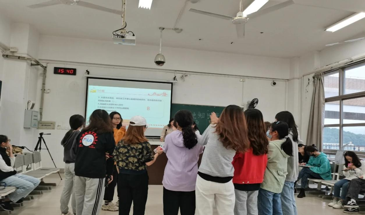 本次活动分为两部分,第一部分为抢答题,所有题目紧紧围绕党的发展历程中的重大事件,主持人读出题目后,同学们通过抢水瓶的方式进行抢答,答对的同学给予相应的加分奖励。第二部分为活动题,所有题目围绕党的发展史上的各大重要节点及意义,题目读出后,由主持人喊开始,同学们分别以“爱的抱抱”、“抢椅子”两种方式进行抢答。活动过程中,同学们表现积极,气氛十分的活跃。