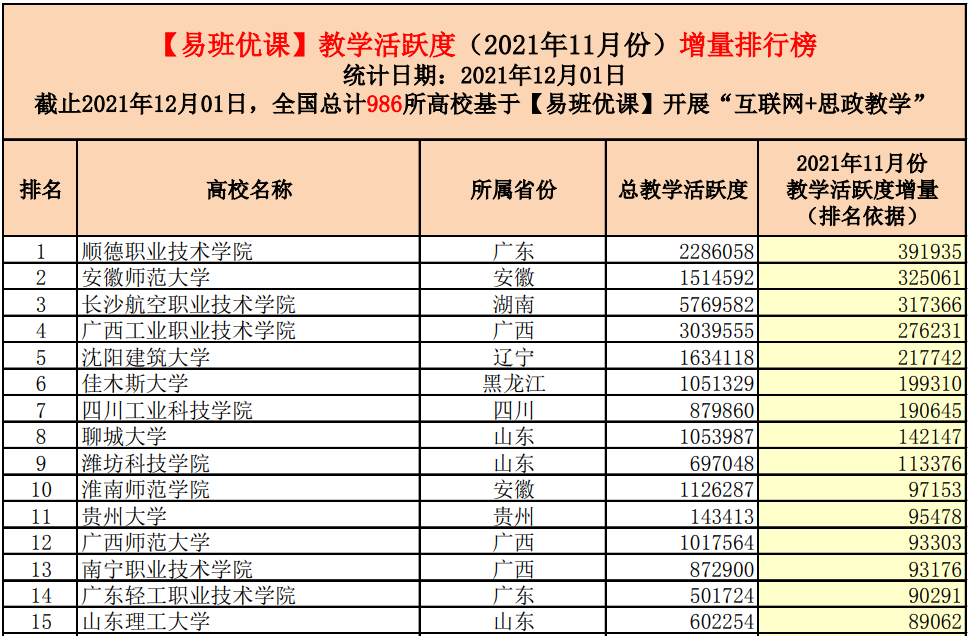 截止2021年12月01日,全国总计986所高校基于易班优课开展“互联网+思政教学”活动,我校易班工作站积极参加此次活动并且排名不断上升。我校十一月份开展了党史学习教育、大学生求职技巧学习活动等,让同学们掌握多方面知识,提高素质教育。我校月度教学活跃度增量高达113376,总教学活跃度697048,在全国11月份易班优课教学增量排行榜中名列第九名,连续两个月位列全国前十名。
