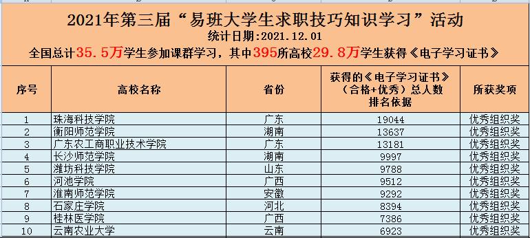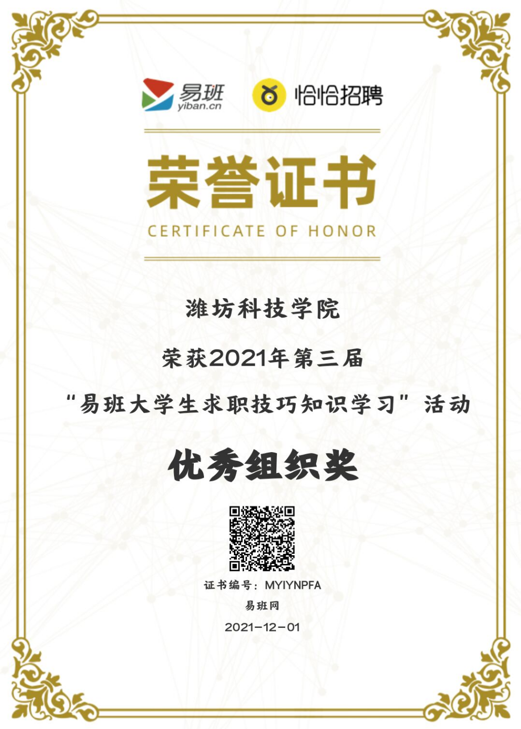 近日,教育部易班发展中心2021年第三届“易班优课大学生求职技巧知识学习”活动获奖名单揭晓,我校9788名学生积极参与,参赛总成绩位列全国高校第五名、山东省高校第一名,我校荣获“优秀组织奖”。