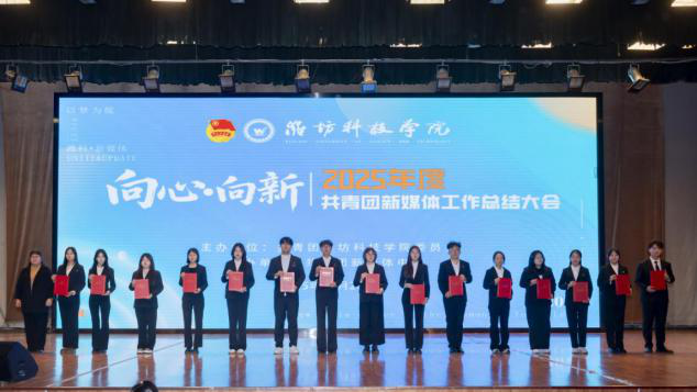 守正创新聚合力,青春逐梦启新程。12月26日,潍坊科技学院2025年度共青团新媒体工作总结大会圆满举行。大会聚焦“向心·向新”的主题,以“光影传情聚力同行、声影逐梦青春绽放、初心赓续共启新程”为篇章,500余名新媒体工作者齐聚一堂,全面总结年度工作成效,表彰先进典型,凝聚奋进力量,推动学校共青团新媒体工作高质量发展。