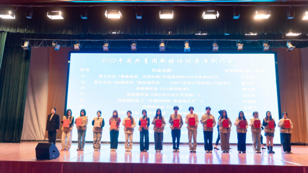 大会对60名“共青团新媒体工作先进个人”与40件“共青团新媒体优秀原创作品”予以表扬。受表扬个人深耕内容策划、平台运营、视觉编辑等一线岗位,以专业素养持续赋能思政表达;获奖作品聚焦青年榜样塑造与校园生活纪实,以青春化、沉浸式的叙事语态弘扬正能量,为学校网络思想政治工作的提质增效注入了生动活力。