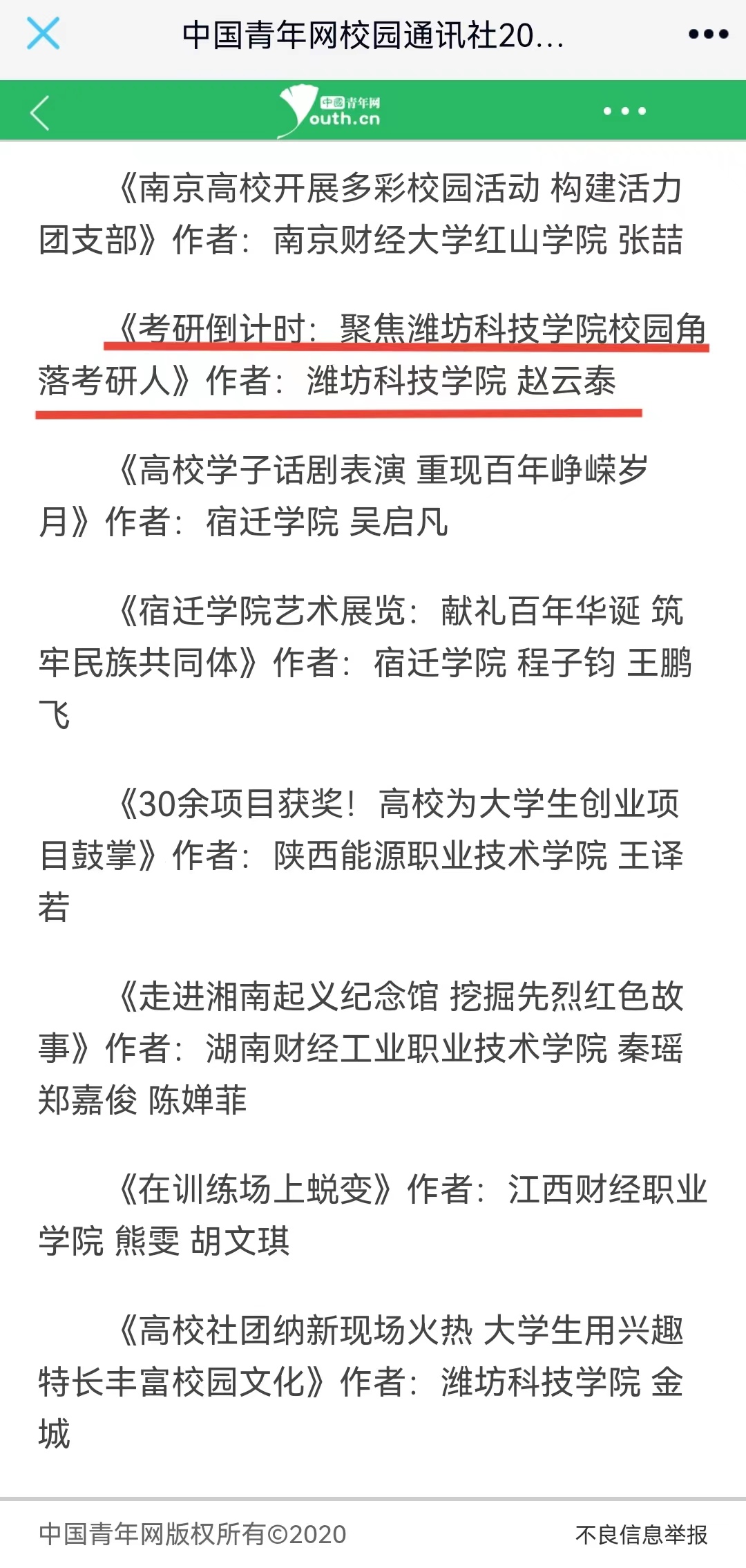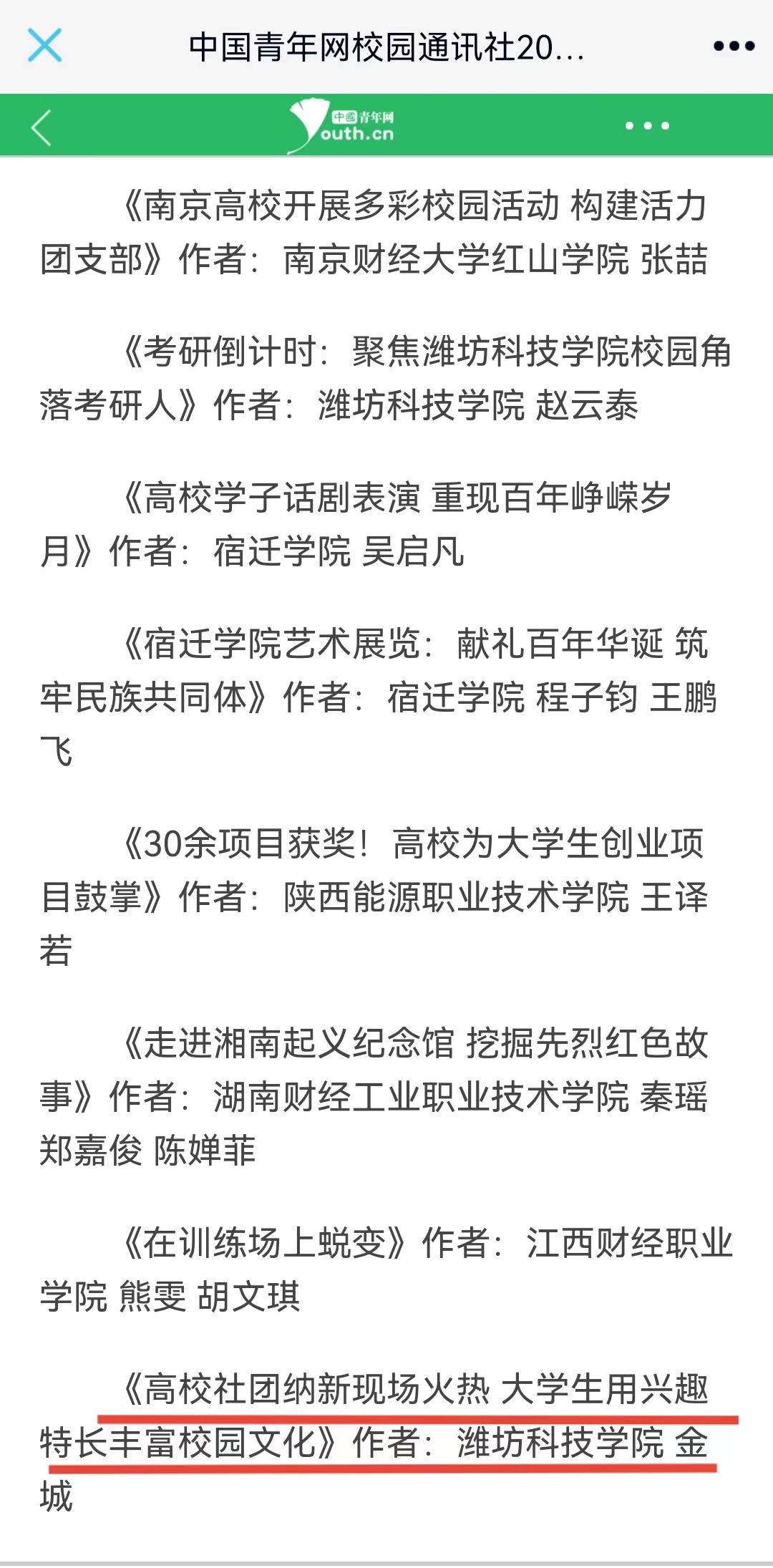 本次活动是由中国青年网主办、中国青年网校园通讯社承办。2021年,中国青年网校园通讯社共收到来自全国各地各学校稿件70万余篇,刊发数量超过9万余篇。经作品初审、网络评选、打分复审、年度考核等环节,对100所优秀通讯站、99名优秀指导教师、131名优秀通讯员、100篇优秀原创稿件及其作者进行表彰。在此项评选中,我校荣获“优秀通讯站”,校团委杜鹏荣获“优秀指导教师”,校园通讯站站长侯宇洁同学荣获“优秀通讯员”,杨懿德同学的《山东一高校举行万人宣誓,礼赞百年华诞》、赵云泰同学的《考研倒计时:聚焦潍坊科技学院校园角落考研人》、金城同学的《高校社团纳新现场火热,大学生用兴趣特长丰富校园文化》荣获优秀原创稿件。