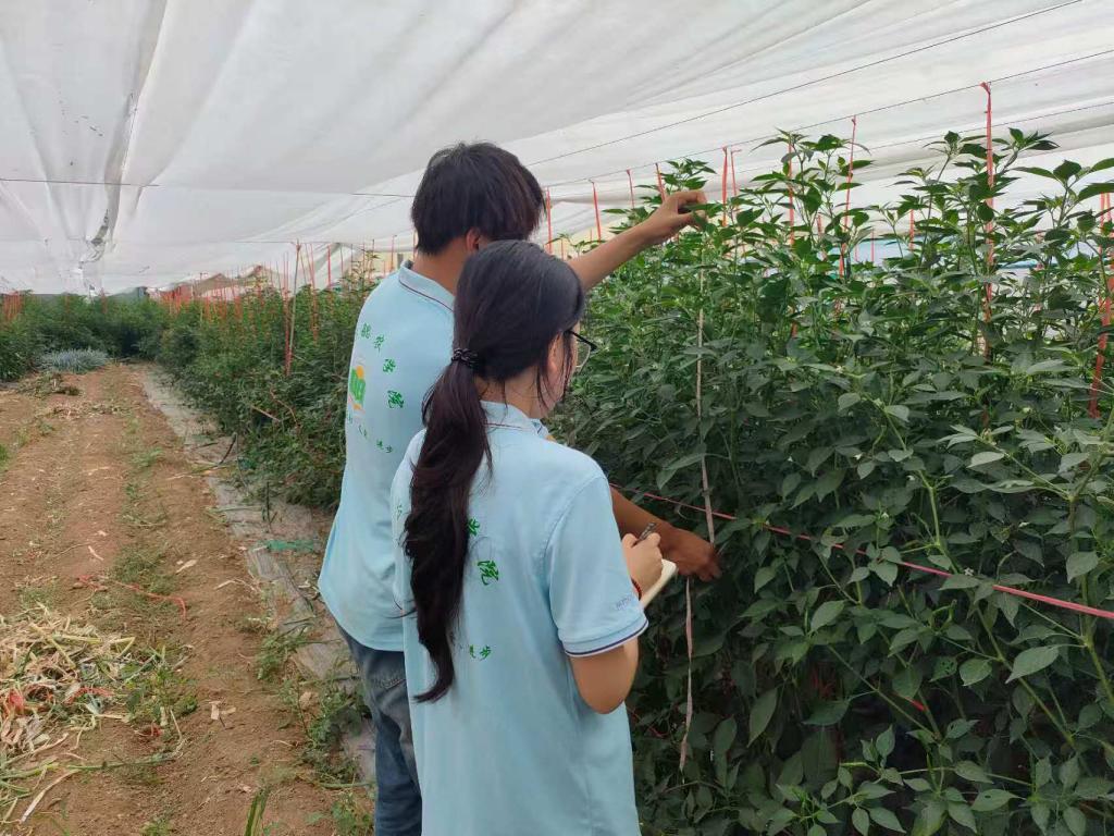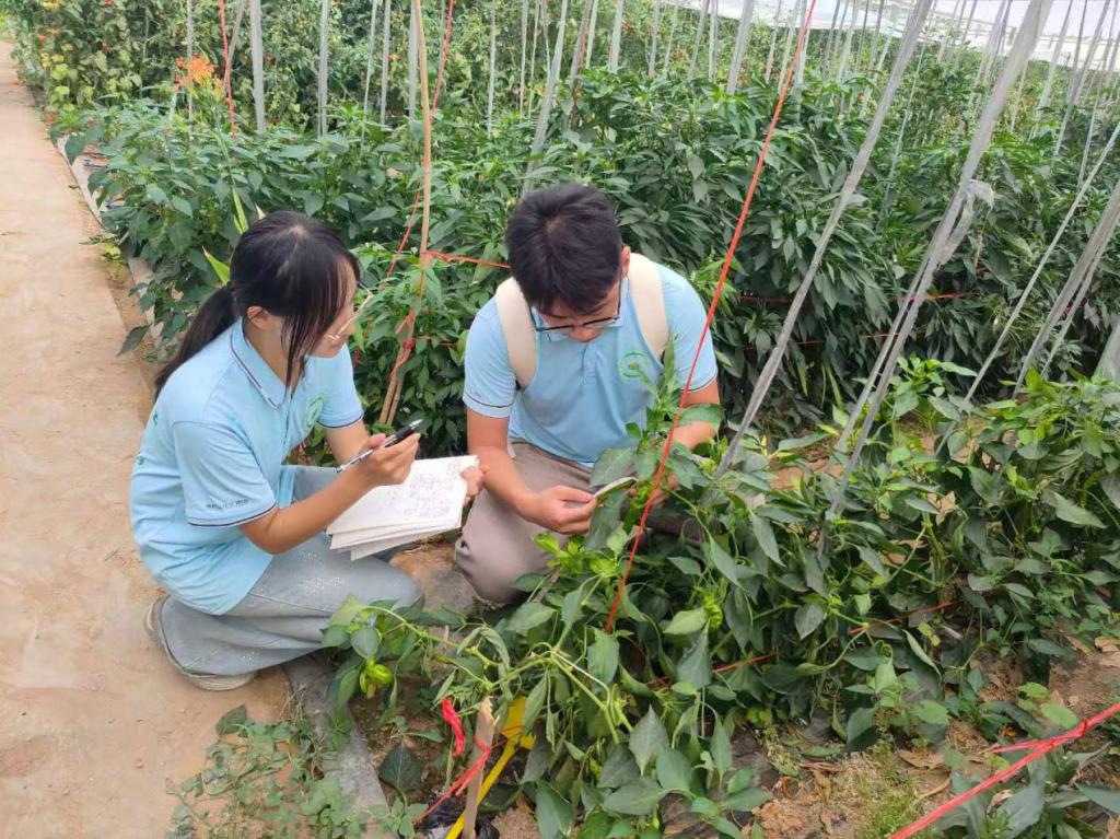团队携带测量设备,对番茄、辣椒、苦瓜等作物的株高、叶面积、果实形态等指标进行精准的测量,队员熟练运用测量工具,确保测量数据的精确性和可靠性。