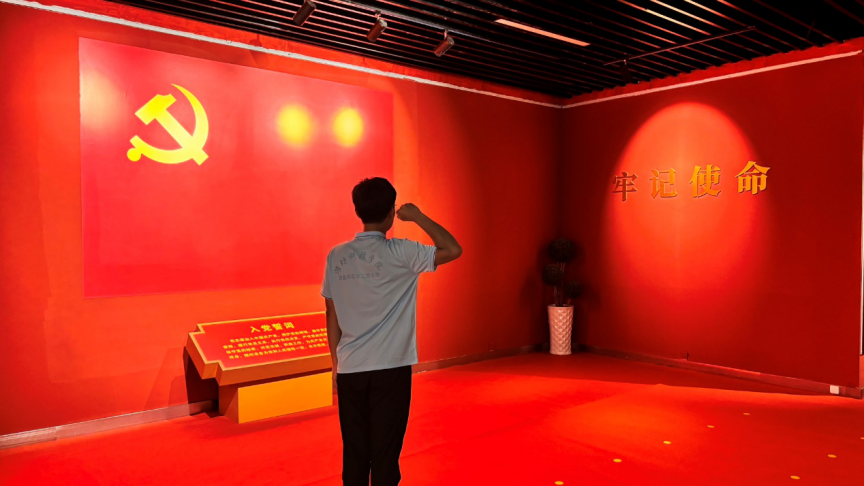 行程的最后,在党旗的见证下,一名队员庄严地举起右手,进行宣誓。“牢记使命”四个大字在红色背景的衬托下,显得格外庄重。入党誓词的每一个字,都深深烙印在心中。