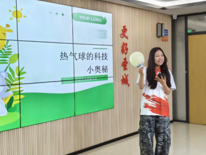 最后为手工制作环节。团队成员有序分发制作迷你热气球的材料,从色彩鲜艳的气球到固定的纸杯支架,品类齐全。孩子们跟随视频演示的具体步骤动手操作,亲手完成制作迷你热气球后,脸上洋溢着自豪的笑容,大家主动上台进行展示,分享自身独特的科学见解。